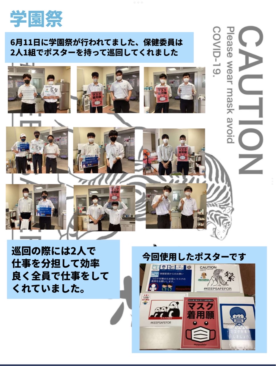 私たちは保健委員会の一環で学園祭の見回りをしました。マスクの着用や換気が出来ているかということを点検しました。今度は体育祭でも頑張りたいです。