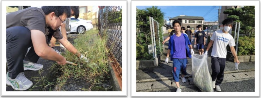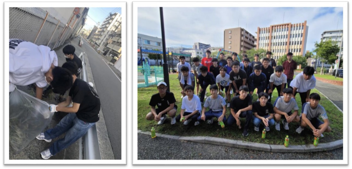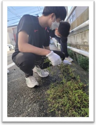 生徒会事務局のメンバー27名で、東福岡高校の周辺や駐車場、東比恵の町内の除草やゴミ拾いなどをしました。普段気にかけないような場所にも、草がたくさん生えていたり、ゴミがたくさん落ちていたりしました。